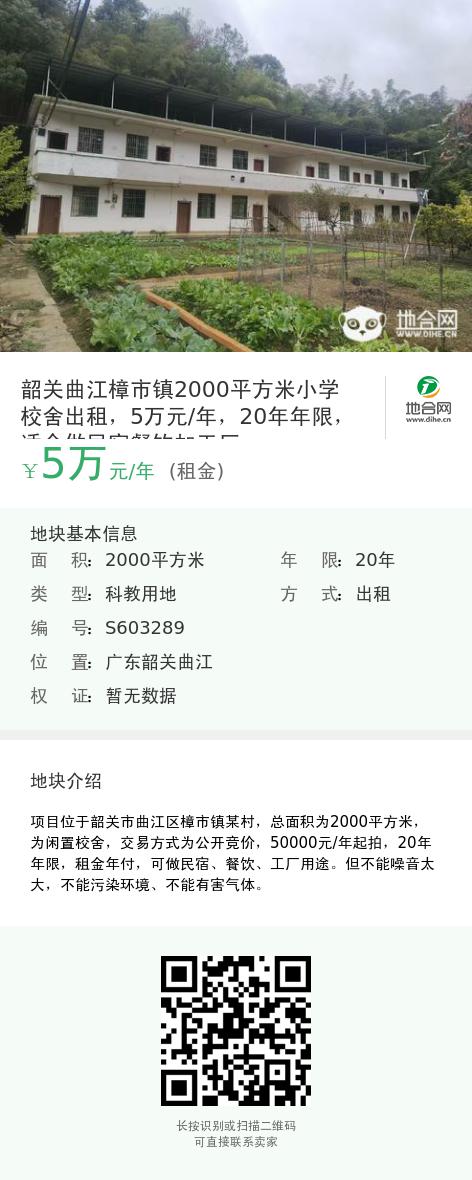 项目位于韶关市曲江区樟市镇某村,总面积为2000平方米,为闲置校舍,交易方式为公开竞价,50000元/年起拍,20年年限,租金年付,可做民宿、餐饮、工厂用途。但不能噪音太大,不能污染环境、不能有害气体。