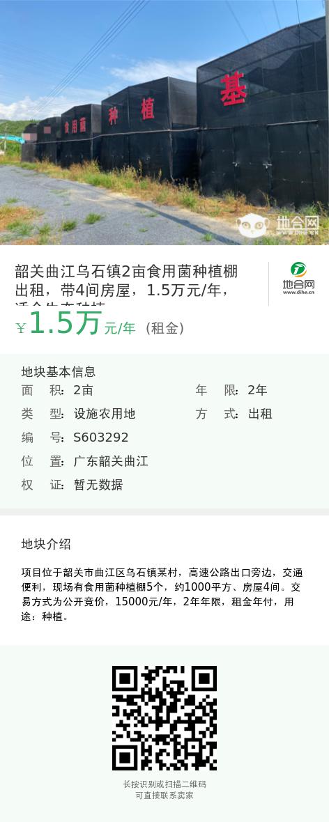 项目位于韶关市曲江区乌石镇某村,高速公路出口旁边,交通便利,现场有食用菌种植棚5个,约1000平方、房屋4间。交易方式为公开竞价,15000元/年,2年年限,租金年付,用途:种植。