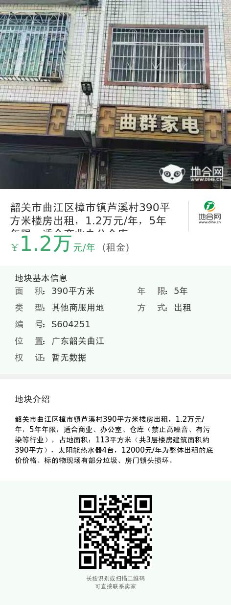 韶关市曲江区樟市镇芦溪村390平方米楼房出租,1.2万元/年,5年年限,适合商业、办公室、仓库(禁止高噪音、有污染等行业),占地面积:113平方米(共3层楼房建筑面积约390平方),太阳能热水器4台,12000元/年为整体出租的底价价格。标的物现场有部分垃圾、房门锁头损坏。