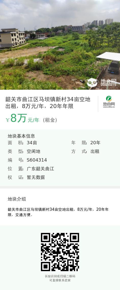 韶关市曲江区马坝镇新村34亩空地出租,8万元/年,20年年限