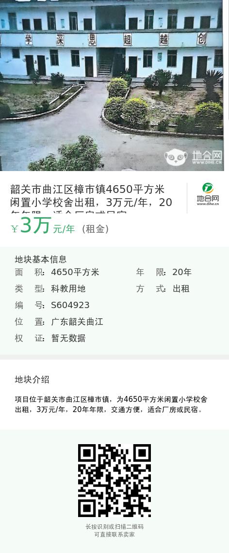项目位于韶关市曲江区樟市镇,为4650平方米闲置小学校舍出租,3万元/年,20年年限,交通方便,适合厂房或民宿。